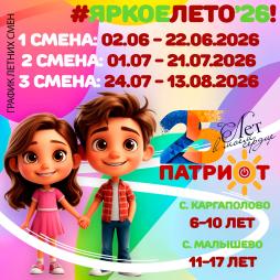 Центр «Патриот» приглашает родителей позаботиться о насыщенном отдыхе для своих детей заранее! График летних смен 2026: 02 - 22 июня 01 - 21 июня 24 июля - 13 августа